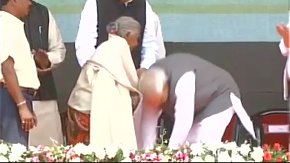 Watch Modi Touch Feet Of 104 Yr Old Who Sold Goats To Build Toilet
